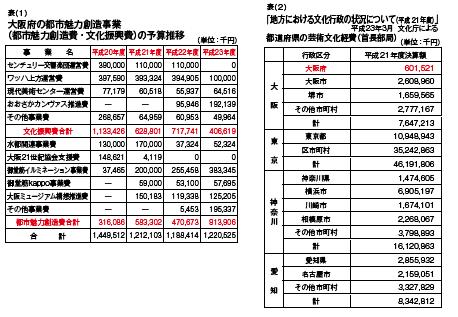 橋下知事の文化振興に対するあり方については、就任以来、随分議論を引き起こしました。橋下知事の考えは、「文化は府民がつくるもの、府県の役割は府民の発表の場の提供が中心である」ということであり、結果的に文化振興費が別表のとおり大きく減額されることになりました。