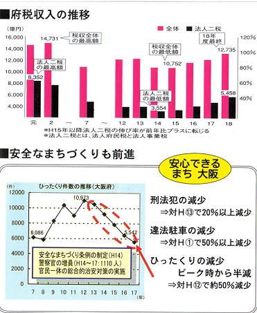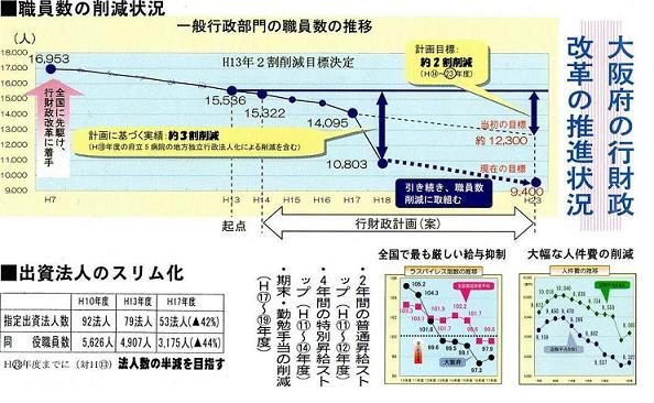 大阪府でも、全国に先駆け、平成7年より開始した行財政改革、財政再建に拍車をかけ、バブルの負の遺産の整理や、府の大きな経費である職員人件費の改革に多大な効果をあげることができました。