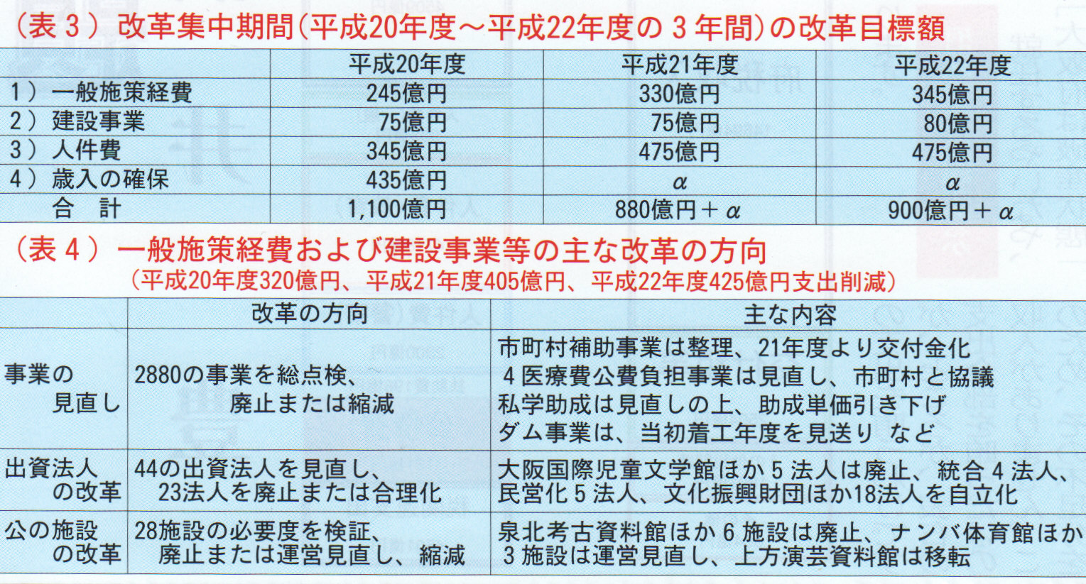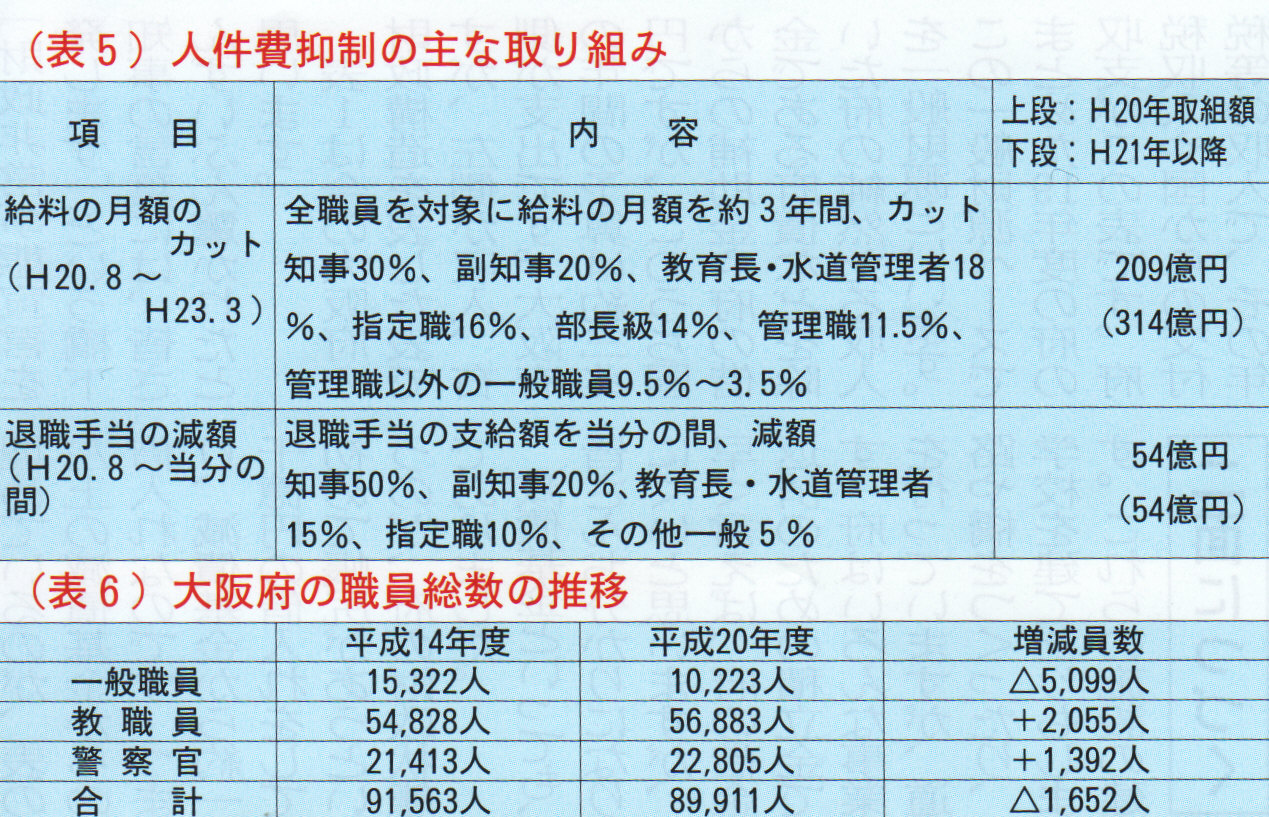 表4・表5はその中身を簡単にまとめたものです。表4にありますように一般施策経費や建設事業では今年度三二〇億円を縮減、表5のように、最大の課題である人件費については、一般職員はもとより、教員や警察官も含め、毎月の給料や、退職金も大幅減額することとしています。さらに、収入の面でも可能な限り増収をはかることと致しております。