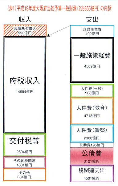 表1は今の大阪府の財政構造を表した表ですが、左側が収入、右側が支出です。大阪府の年間の予算は約三兆円ですが、このうち国からの補助金や府の借金である府債などを除いた府の純然たる収入を一般財源といいます。この一般財源ベースでまとめた19年度の府の収支がこの表です。府税収入や国からの交付税等の収入で、その年の支出を賄うわけですが、ところが、表右の支出全部を賄うだけの収入がありません。このため、その不足分を埋めているのが、表の左上の減債基金からの借入れなのです。つまり、減債基金から約一千億円の借入れをして初めて帳尻があうというのが、府の財政状態でありました。